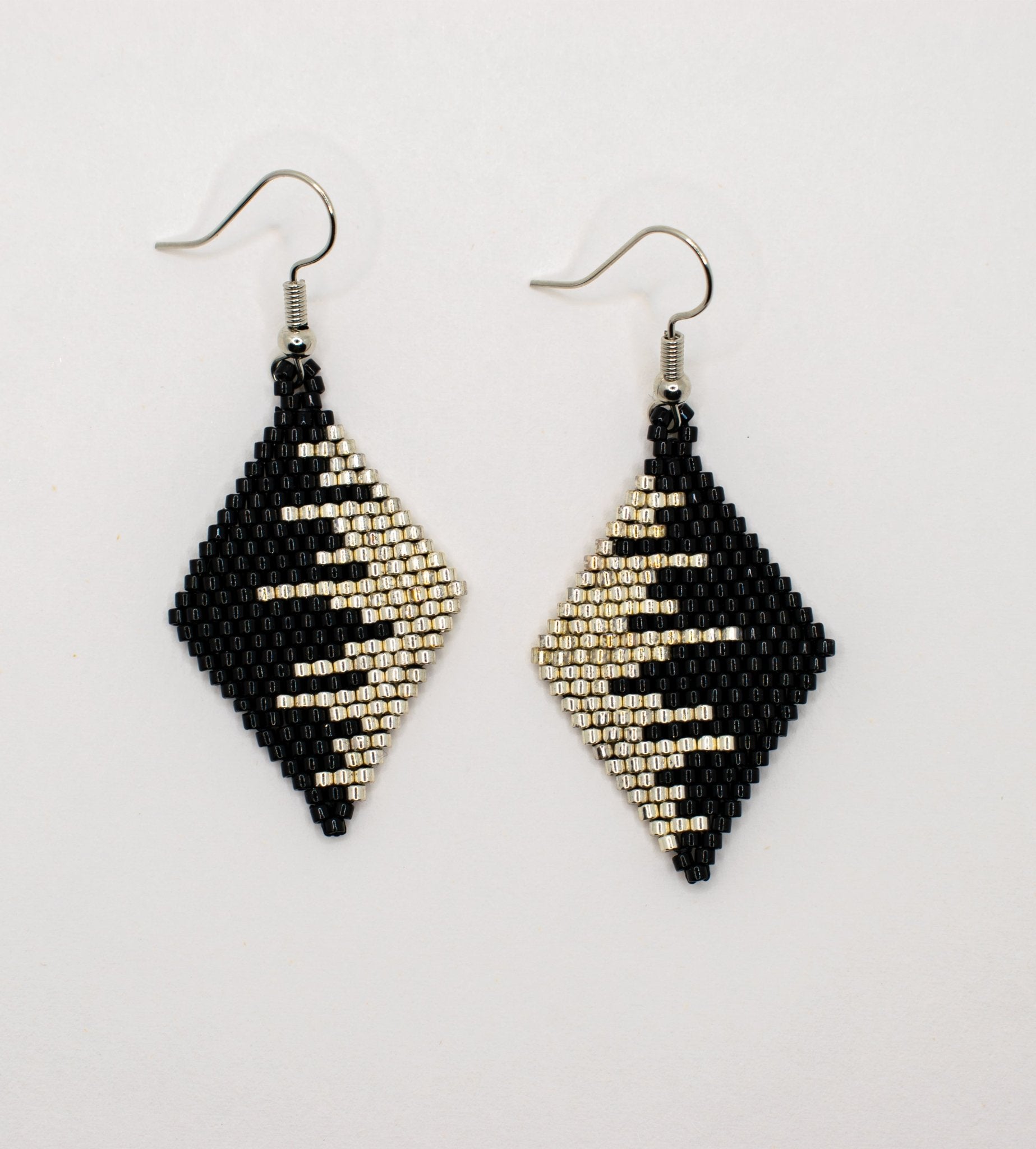 Black & Silver Monochrome Waves Diamond Shaped Beaded Earrings