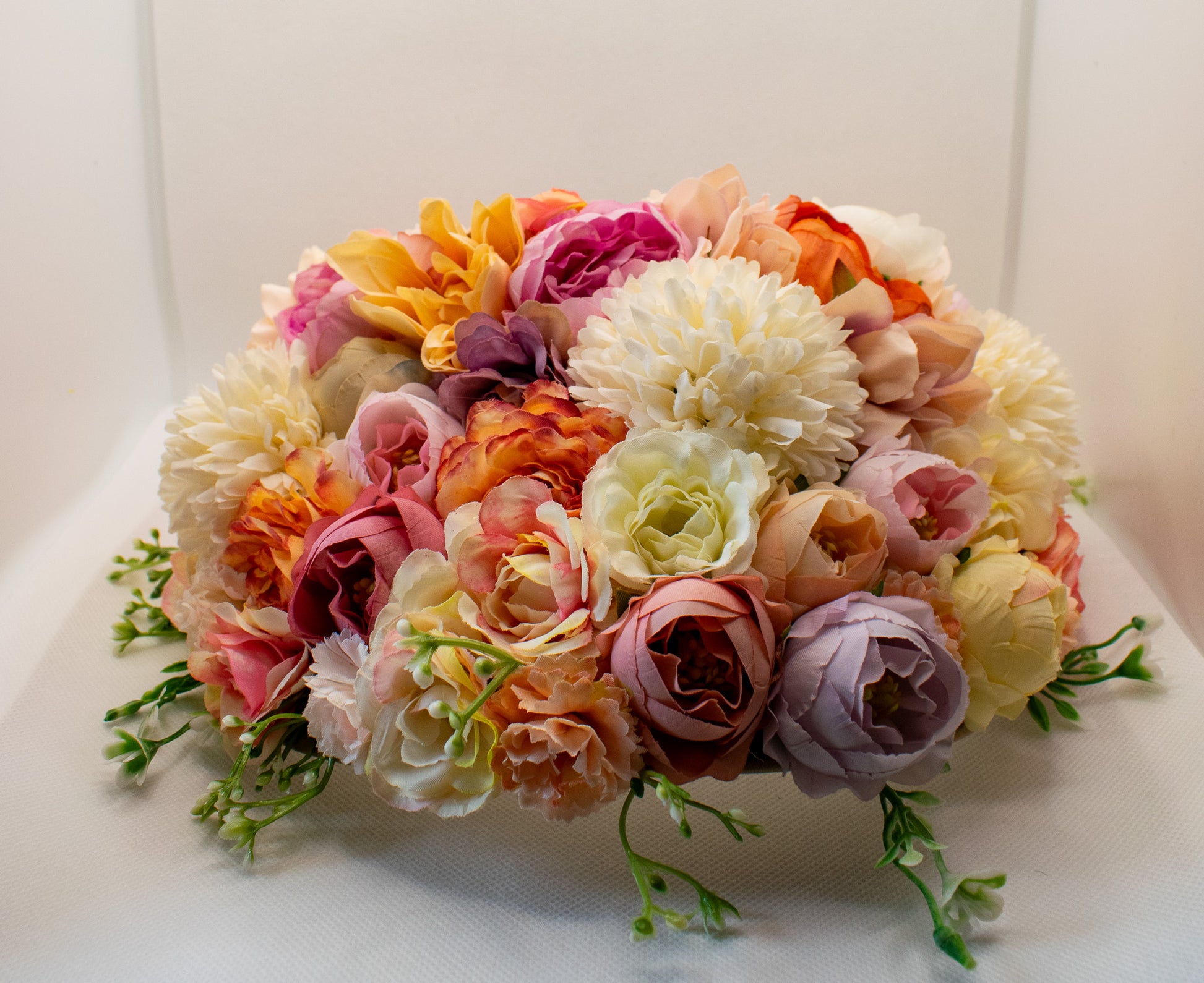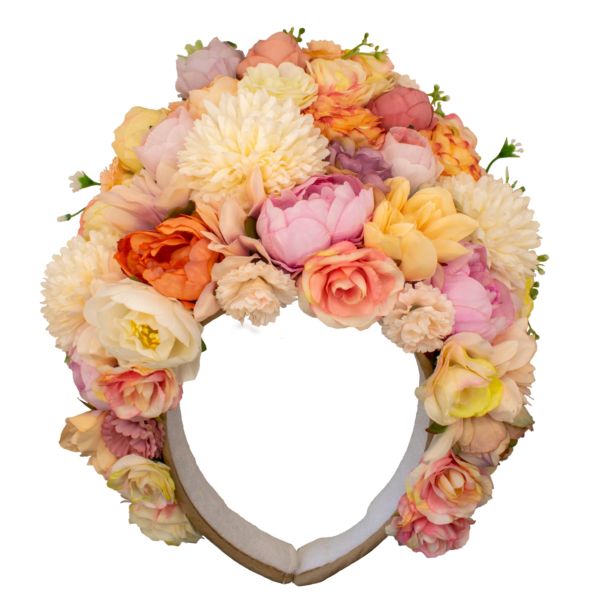 Roses symbolize deep emotions and affection, representing love and romance. Peonies embody femininity, grace, and elegance, adding refinement to the crown's beauty. Chrysanthemums bring vibrant colors and a sense of joy and happiness, infusing the crown with positive energy.