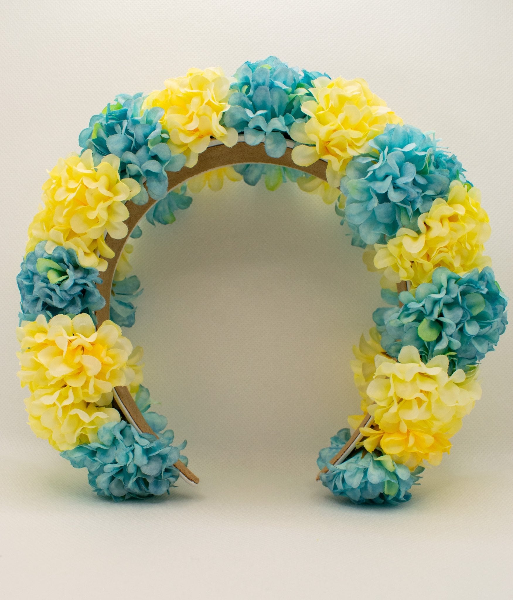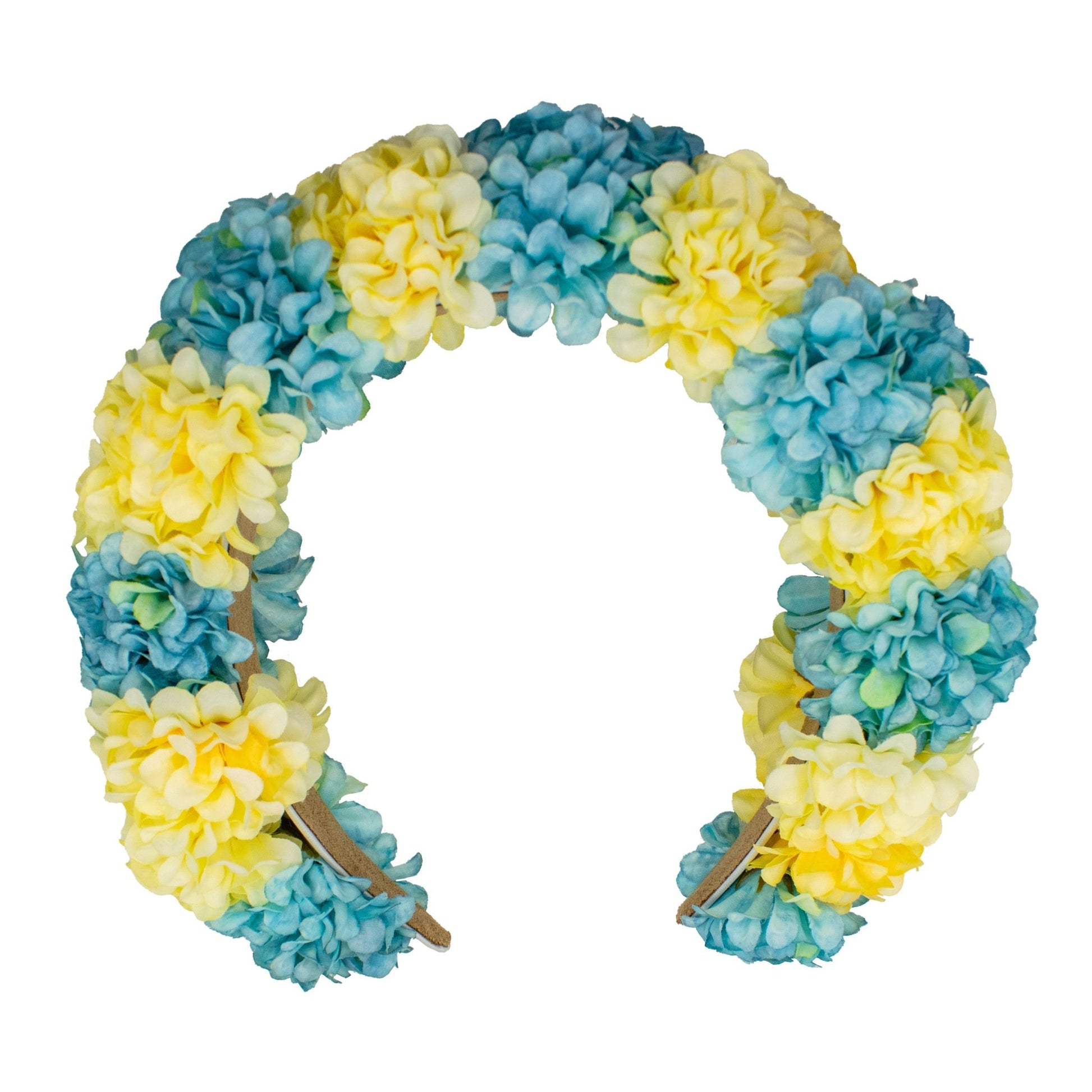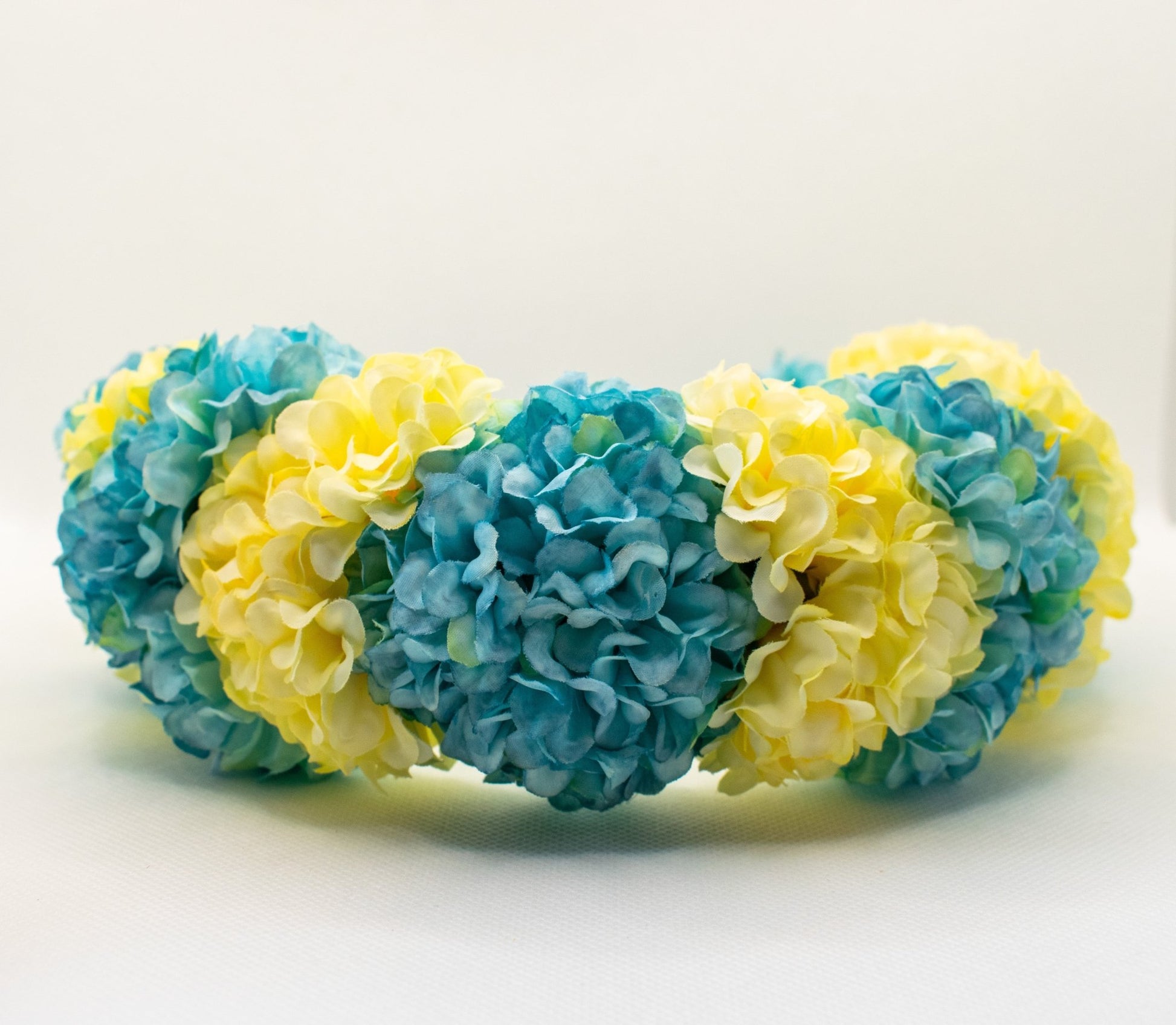 Introducing our stunning Blue and Yellow Flower Crown Ukrainian Vinok, meticulously handcrafted with vibrant yellow and serene blue hydrangeas on a comfortable satin headband. This exquisite piece embodies the beauty of Ukrainian culture and the powerful symbolism of its colors.