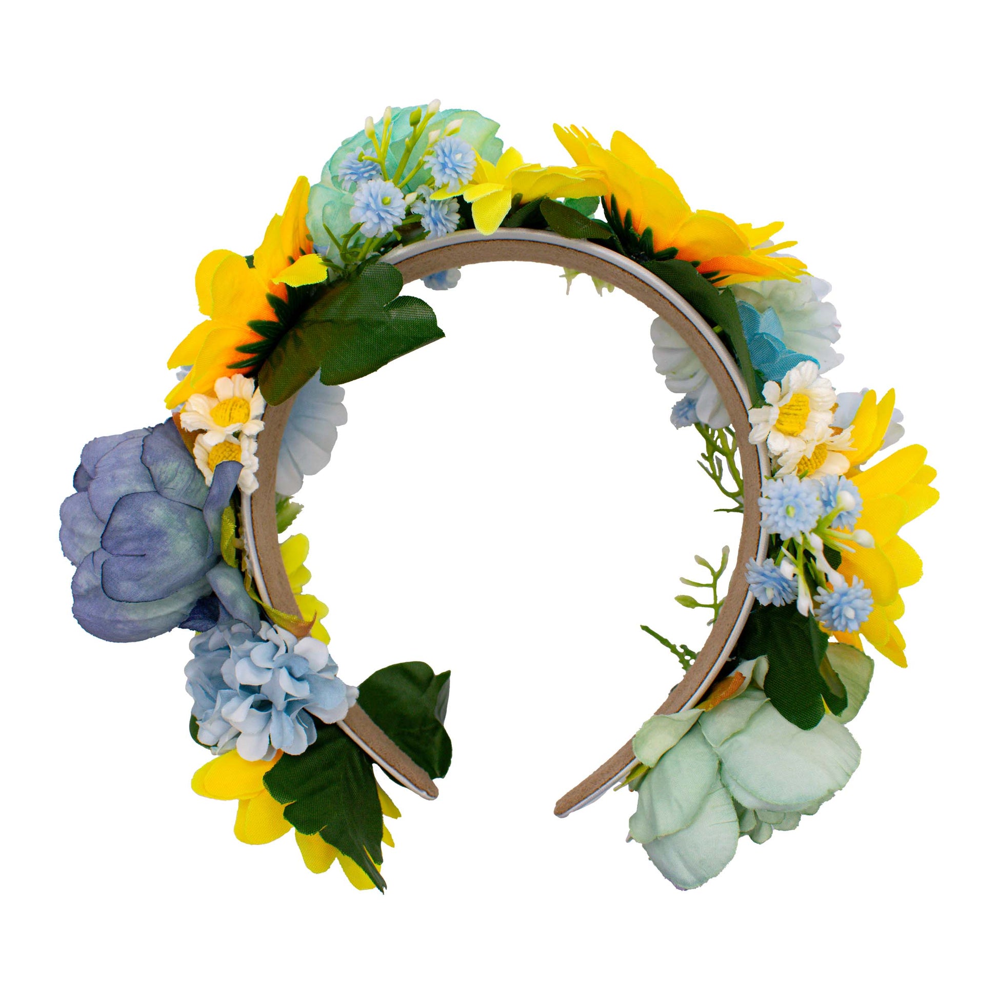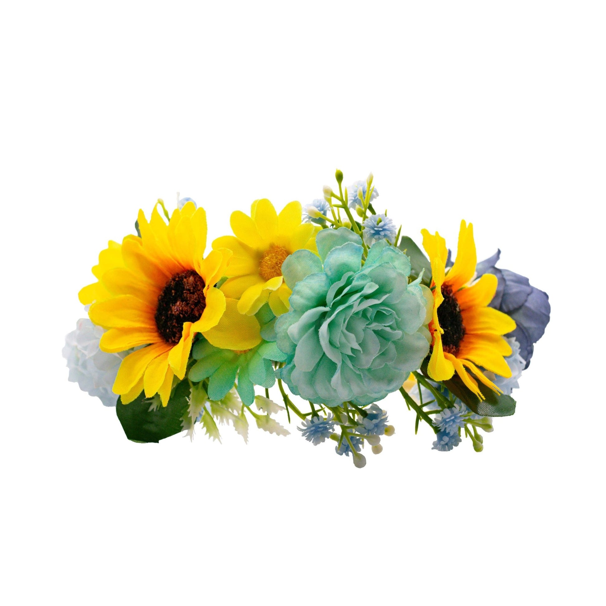 Our one of a kind Blue And Yellow Mix Flower Crown, meticulously handcrafted with a delightful blend of sunflowers, daisies, peonies, and hydrangeas on a comfortable satin headband. Each flower in this exquisite piece carries profound symbolism in Ukrainian culture, creating a stunning representation of joy, beauty, femininity, and prosperity.