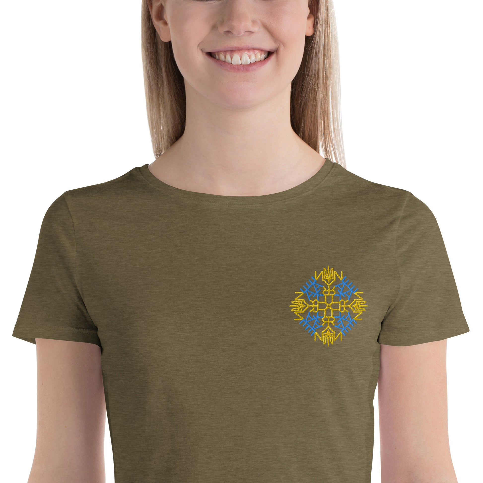 Take a risk and stand out from the crowd with our Ukraine Embroidered Women's Crop Tee! This bold and unique crop top features an intricately woven design inspired by the Ukrainian flag, with the word "Ukraine" and the iconic gold trident incorporated into the minimalist embroidery. Don't settle for ordinary when you can make a fashion statement and show your love for Ukraine with this eye-catching top. Tight-fitting and comfortable, this crop tee will be the trendiest piece in your wardrobe this season. It hits just above the navel, giving you a perfect fit and an adventurous look. Get ready to make a daring fashion choice with our Ukrainian-inspired crop tee!
