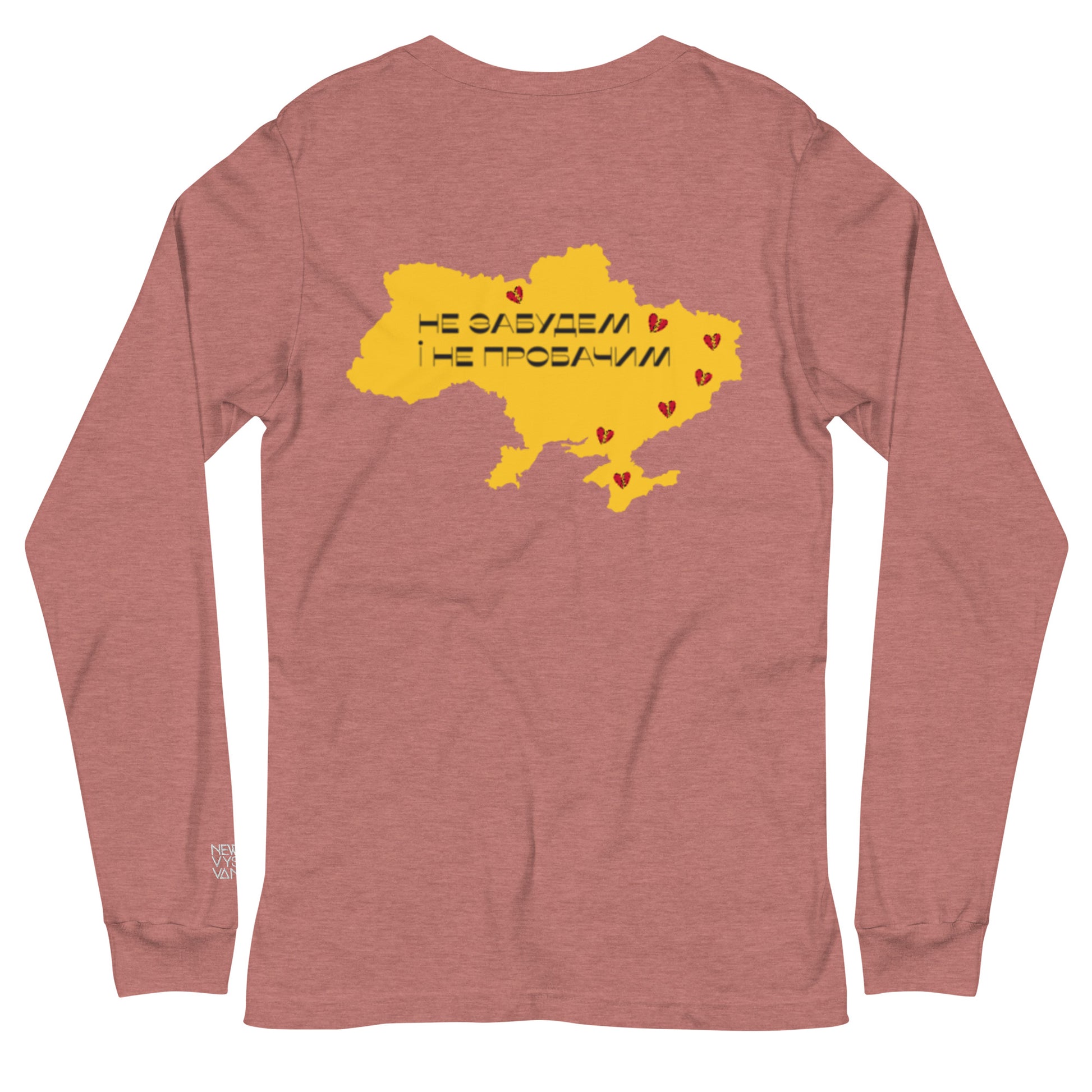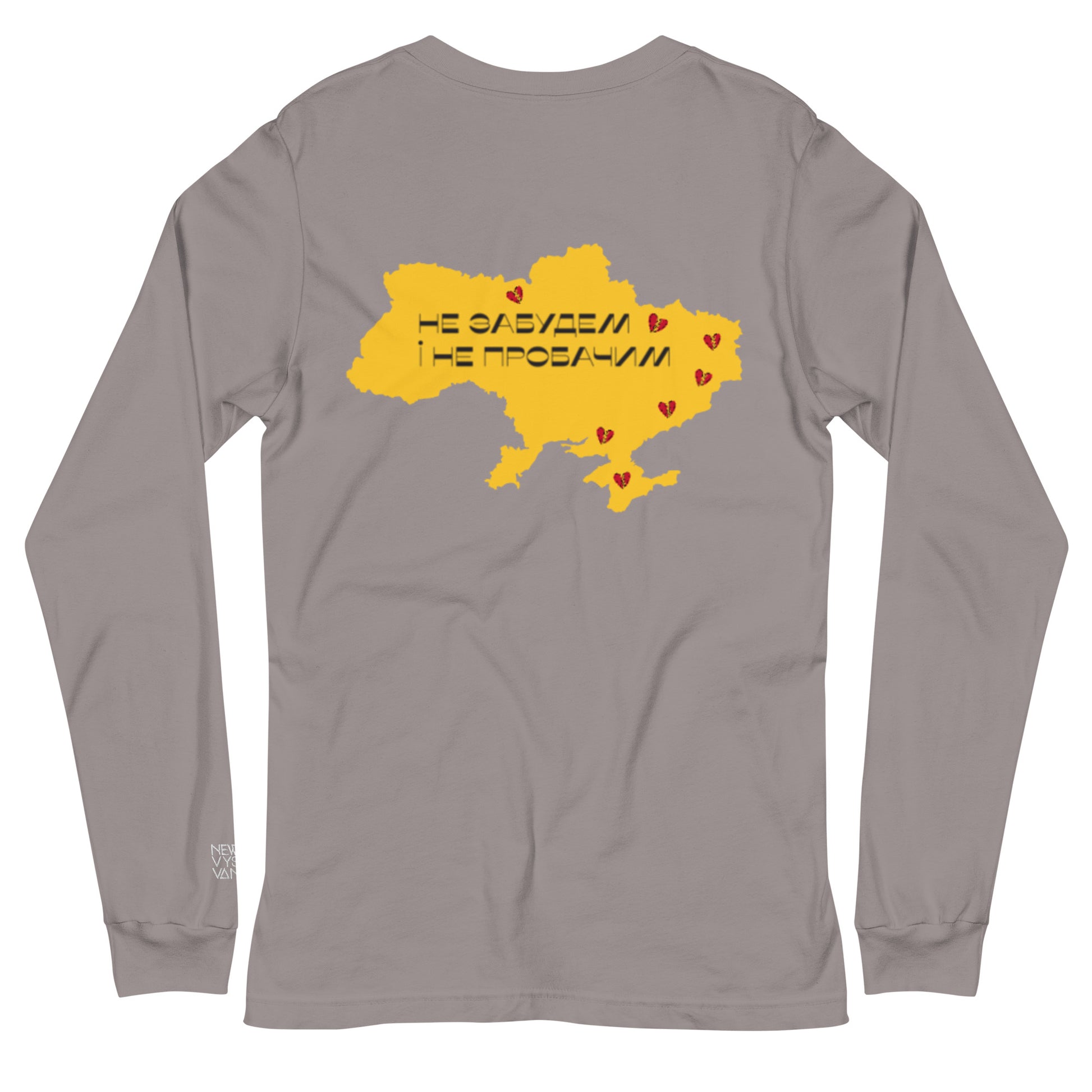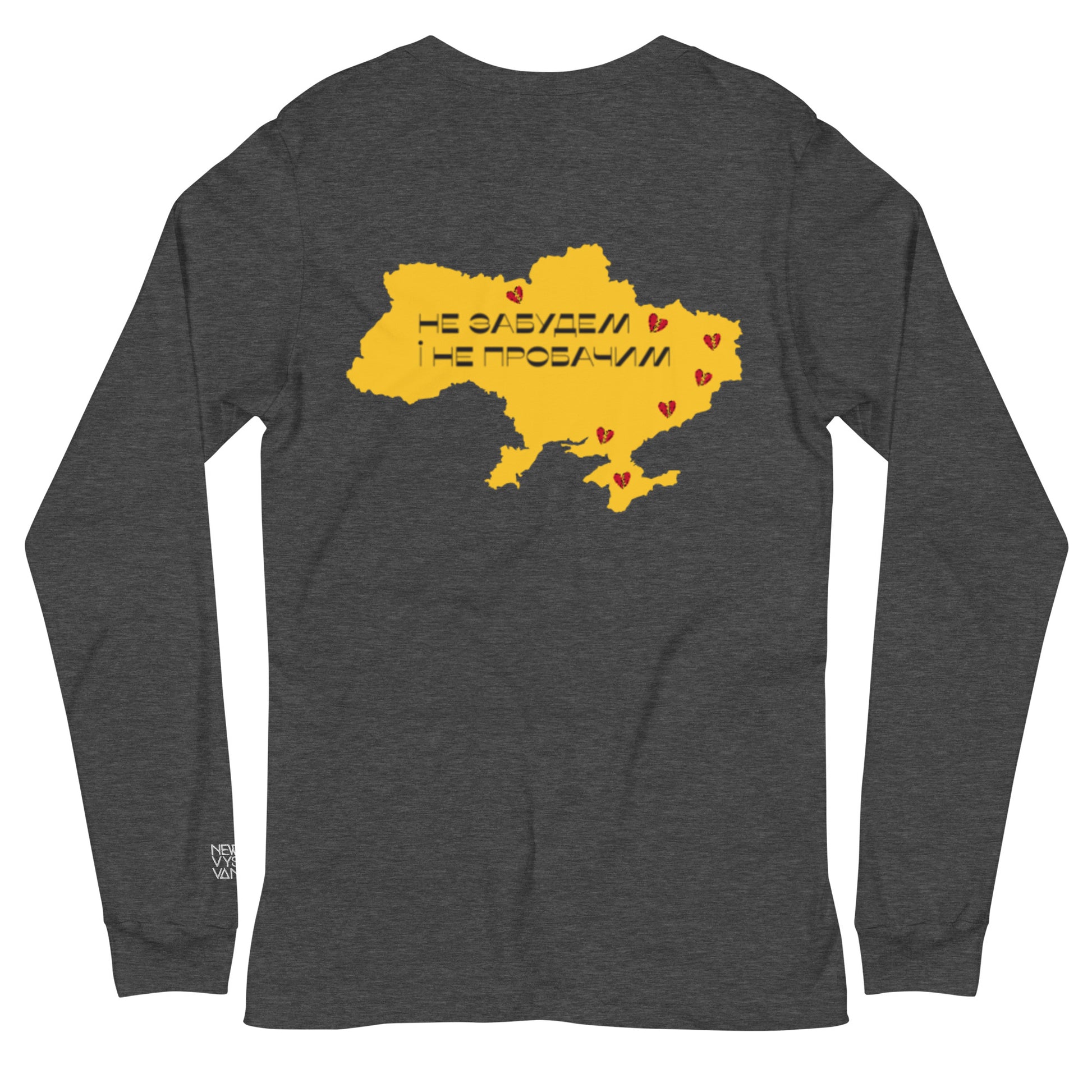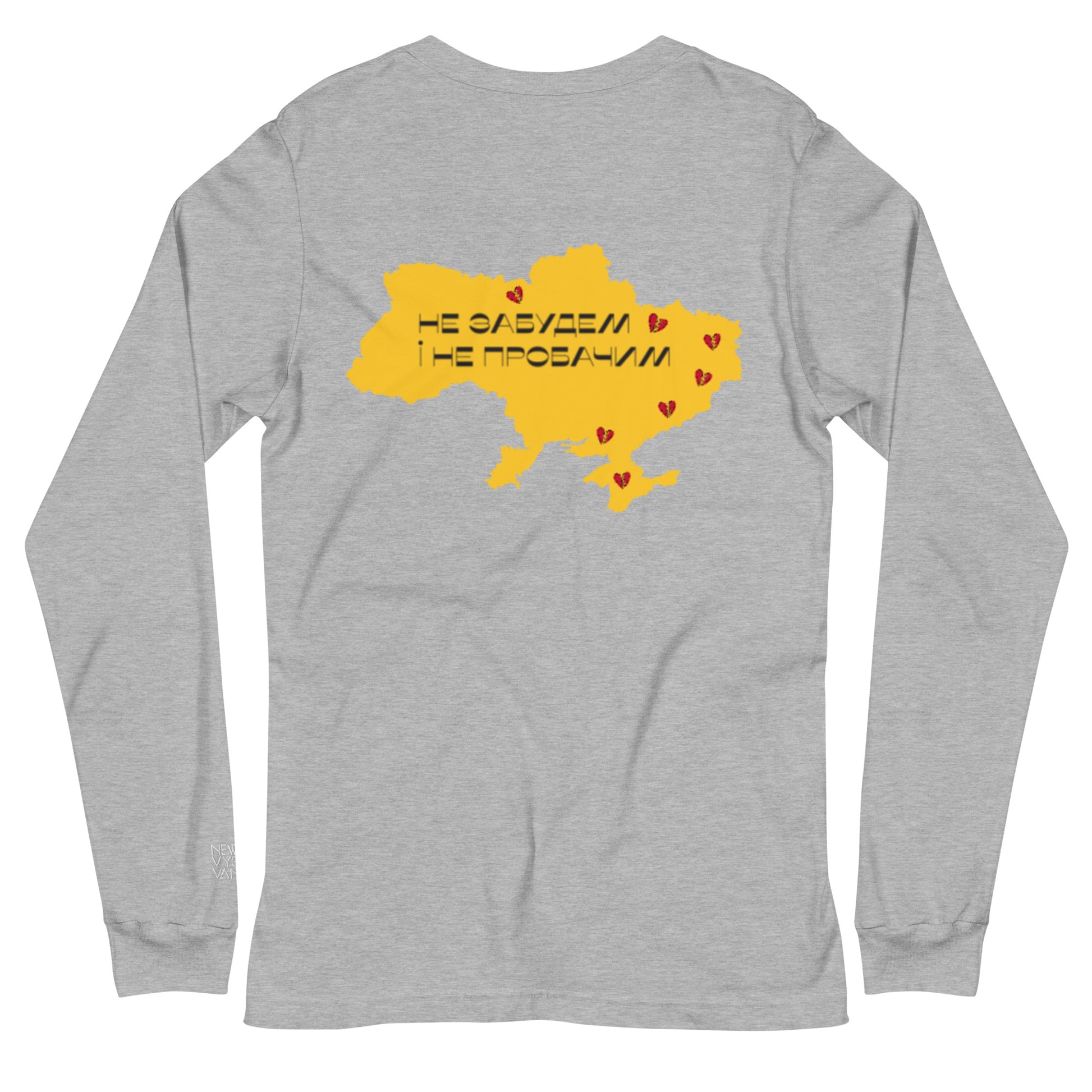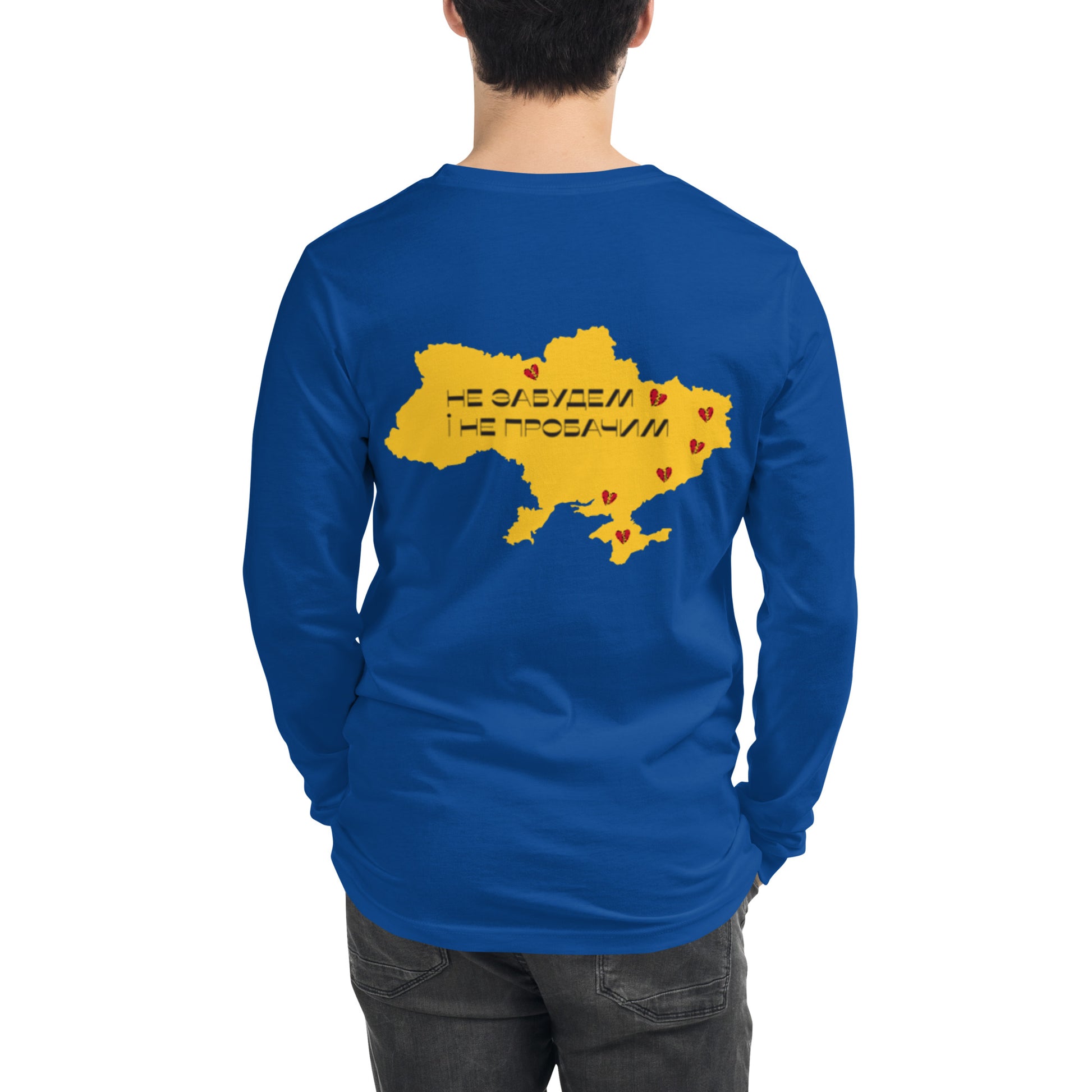 Wear your pride for Ukraine on your sleeve with our versatile long sleeve tee. Made with 100% combed and ring-spun cotton, this long sleeve tee features an intricately embroidered Ukrainian coat of arms on the front and a striking digital print of the map of Ukraine on the back. The words "Will not forget and not forgive" written in Ukrainian text add a powerful message to this design.